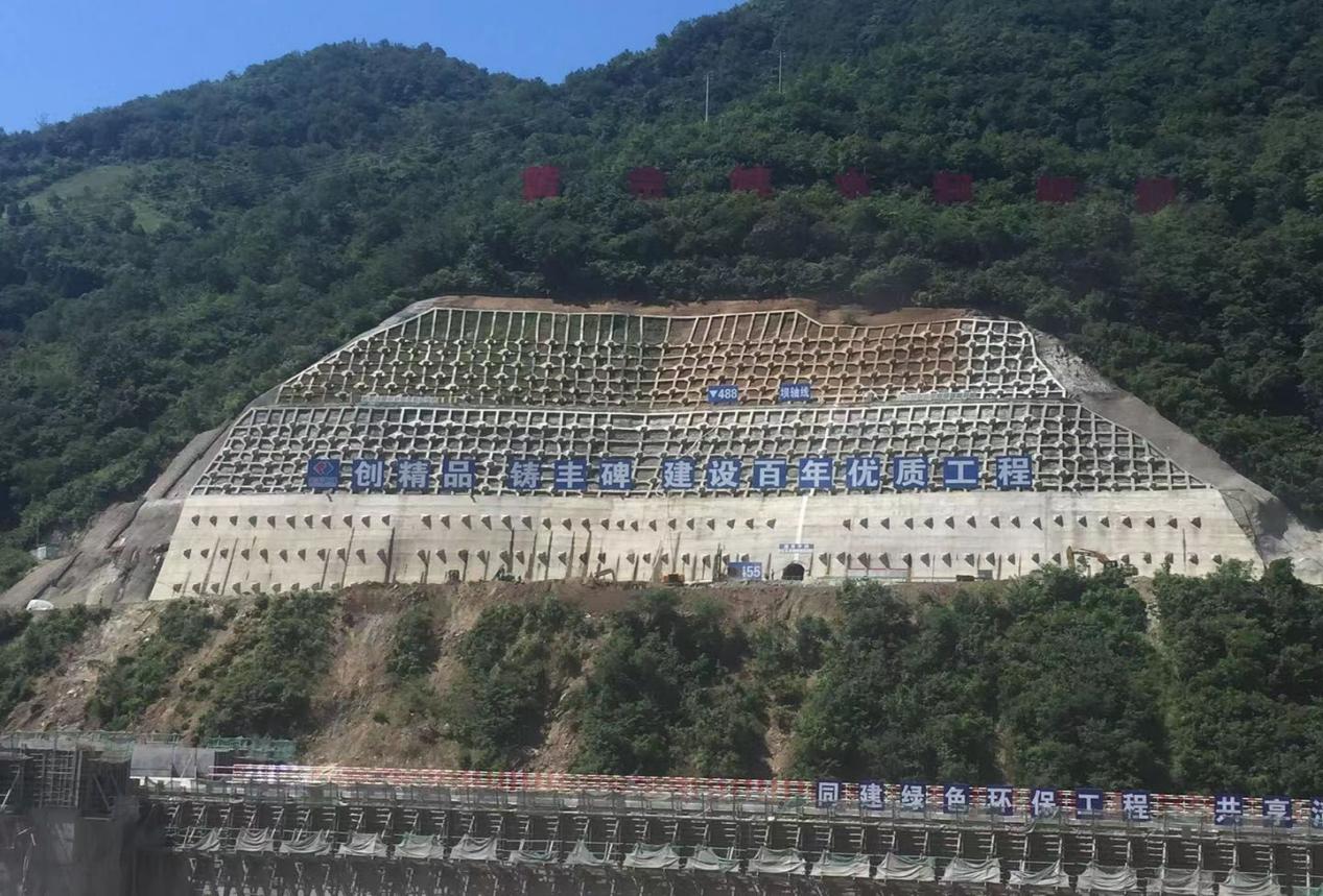 本工程試驗(yàn)區(qū)位于黃金峽大壩右岸壩肩框格梁混凝土邊坡內(nèi),高程范圍為EL488m~EL512m,坡度接近1:0.35,框格梁尺寸約為2m*2m,預(yù)留排水孔,面積約7000㎡。2018年12月,經(jīng)項(xiàng)目部相關(guān)部門多方調(diào)研后,最終選用三峽大學(xué)潤(rùn)智生態(tài)科技研究院的專利技術(shù)—植被混凝土生態(tài)修復(fù)技術(shù)對(duì)右壩肩框格梁邊坡以及其延伸段的一塊混凝土邊進(jìn)行“引漢濟(jì)渭生態(tài)修復(fù)試驗(yàn)工程”示范。如下圖所示: